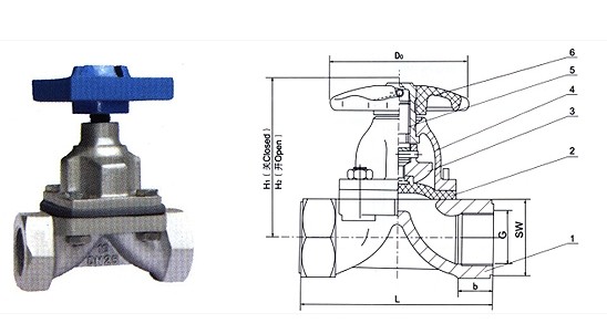 部件列表:1.阀体 2.隔膜 3.阀瓣 4.阀杆 5.阀盖 6、手轮